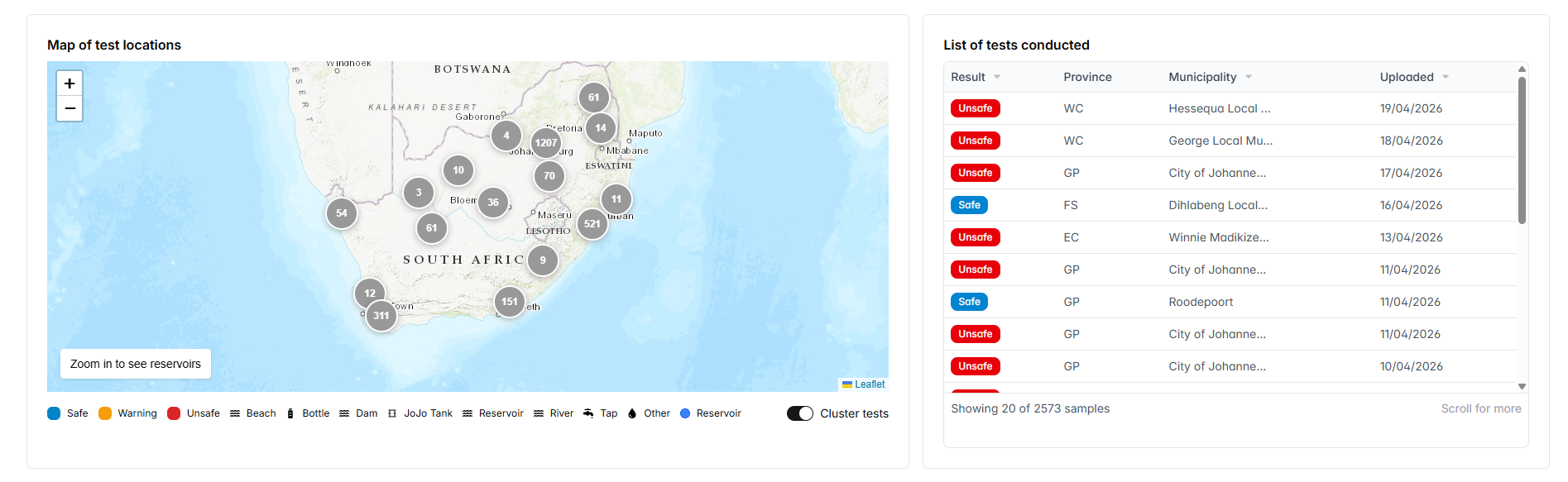 WaterCAN’s new and improved Map My Water dashboard allows users to to upload and access water sample data reporting the safety and health of water sources across all nine provinces. Any South African citizen can become a citizen monitor through WaterCAN. Become a citizen scientist now to help promote water safety justice, and accountability in your community today.