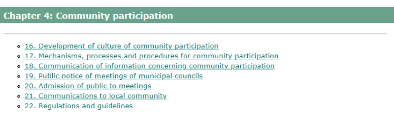The Constitution of South Africa speaks to the responsibility of the National Assembly and National Council of Provinces to provide public involvement in the legislative and other processes of the legislatures and their committees in Sections 59, 72 and 118 respectively. To the average citizen, it's very unlikely that they would ever attend a parliamentary meeting or portfolio committee meeting at either National or Provincial level. Closer to home of any citizen is its Municipality.